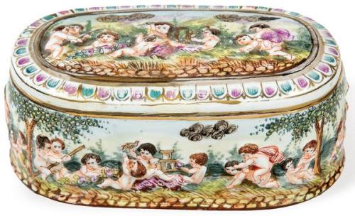 Lote 310: Caja en porcelana esmaltada de Capodimonte. Con marca en la base. Siglo XX.