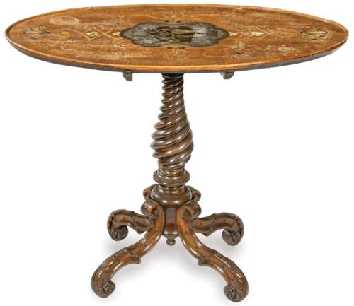 Lote 318: Mesa auxiliar de tapa ovalada abatible en madera de nogal con escena central galante en cartela en embutido metálico con decoraciones en maderas finas y hueso. Sobre pedestal de torneado helicoidal apoyado sobre patas talladas. Siglo XIX.