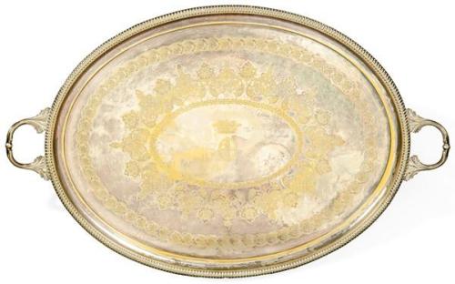 Gran bandeja de metal plateado oval con dos asas con iniciales coronadas grabadas en el asiento.