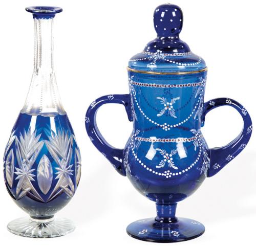 Lote 321: Botella sin tapón de cristal de Bohemia tallado y parcialmente esmaltado en azul y jarra con tapa de dos asas en azul cobalto de tipología Granja pp. S. XX.