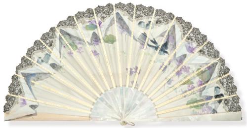 Abanico pericón con varillaje de nácar y país de tul pintado y encaje en el borde ff. S. XIX