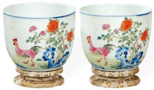 Lote 325: Pareja de vasos de porceana china con esmaltes polícromos con decoración de gallos y texto en caracteres chinos