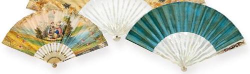 Uno de madera pintada con escena clásica (roto), uno con varillaje de asta y hueso y país de papel con escena galante y otro con varillaje de nácar con país de tela azul.
