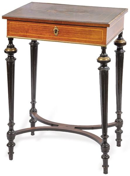 Lote 327: Mesa auxiliar Napoleón III estilo Luis XVI en madera de palosanto con embutido de limonicllo sobre patas de madera ebonizada. Molduras y detalles en latón. (Faltas). Francia, segunda mitad del siglo XIX.