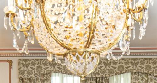 Lámpara de techo estilo Luis XVI con estructura de bronce con sartas y pandelcoas de vidrio prensado. Principios del siglo XX