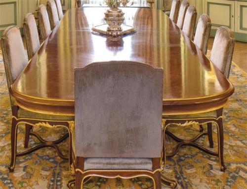 Lote 404: Mesa de comedor estilo Regencia en madera de caoba con tapa rectangular moldurada sobre 3 pedestales decorados con hojas de acanto en madera dorada apoyados sobre cuatra patas ligeramente cabriolé. Siglo XX