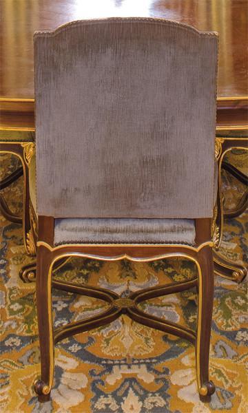 Lote 405: Conjunto de 16 sillas estilo Regencia con respaldo recto sobre patas en madera de caoba con decoración vegetal tallada y dorada. Con tapicería de tela verde. Siglo XX.