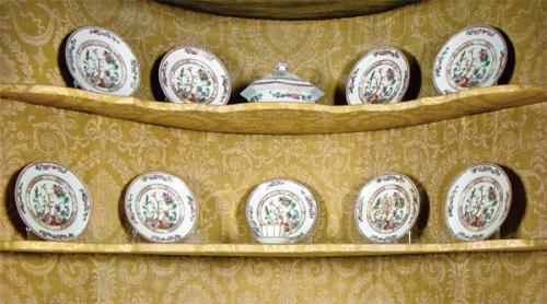 Vajilla en porcelana esmaltada con decoración floral y filo de greca geométrica. 2 soperas, 1 ensaladera, 1 fuente octogonal, 18 platos llanos, 11 platos hondos y 14 platos de merienda.