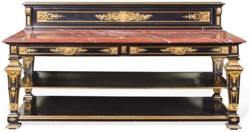 Lote 434: Aparador estilio Luis XIV en madera ebonizada de tapa gruesa rectangular moldurada en mármol rojo. Con dos grandes cajones en la cintura sobre patas en estípite y dos baldas. Con monturas en bronce dorado. Siglo XX