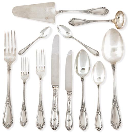 Con decoración grabada de la cruz de la Orden del Santo Sepulcro de Jerusalén. Decoración de hojas de laurel, rocalla y roleos. Formada por: 12 cucharas, 12 tenedores, 12 cuchilos, 12 cucharas lunch, 12 tenedores lunch, 12 cuchillos lunch, 12 cucharillas de postre, 12 cucharas de café y cuatro cubiertos de servir.