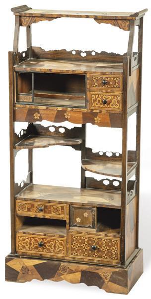 Lote 512: Mueble auxiliar en madera de nogal con estanterías y cajones con decoración de marquetería de motivos geométricos.