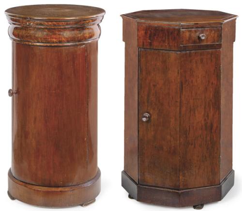 Dos mesas de noche, una circular y otra octogonal, ambas con puertas abatibles.