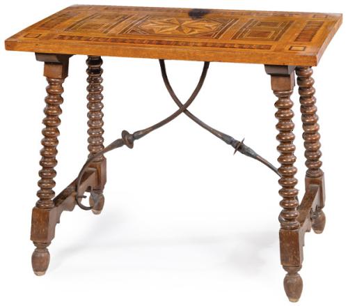 Lote 555: Bufete siguiendo modelos del siglo XVII con tapa rectangular en madera de nogal con marquetería de motivos geométricos sobre patas de torneado denticular y fiadores de hierro. Siglo XX.