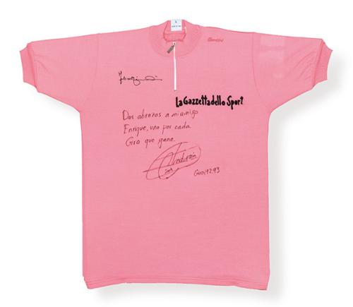 Firmado y dedicado por Miguel Indurain duarnte el Giro de Italia 2004, haciendo referencia a sus dos victorias en los años 92-93