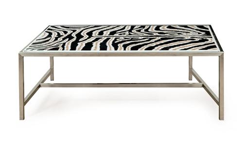 Mesa baja, de tapa rectangular realizada en contrachapado pintado sobre estructura de acero inoxidable cepillado y metal esmaltado.