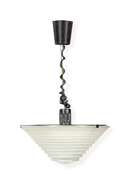 Lámpara de suspensión "Egina 38", fabricada con una gruesa pantalla de cristal esmerilado sobre una estructura de metal.