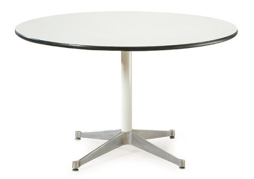 Mesa de comedor redonda en madera laminada en blanco y canto negro, sobre estructura en aluminio cepillado y lacado en blanco.
