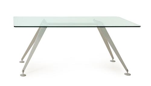 Mesa modelo Alunita de Llusca, con tapa rectangular de vidrio templado, sobre estructura realizada en aluminio inyectado, en forma de triángulo isósceles invertido, unidas por un travesaño cilíndrico, mediante un sistema de mordaza.