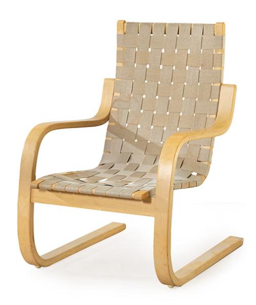 Butaca modelo Sunne, con estructura de madera de haya y asiento de tiras de yute trenzado (deteriorado).