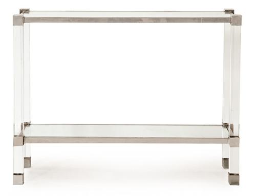 Consola rectangular en metacrilato, vidrio y metal cromado.