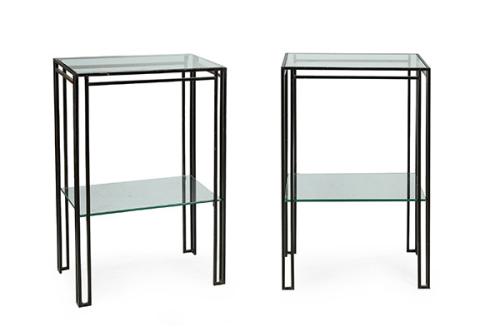 Pareja de mesas-peanas con estructura de metal pintado en negro, con tapa y balda de vidrio.