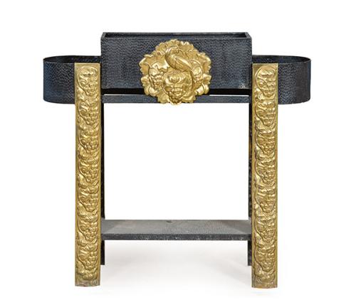 Jardinera Art Decó, con estructura de metal pintado de negro y latón repujado con motivos vegetales.