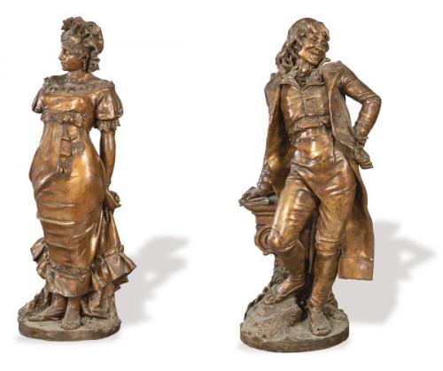Francisco Font Y Pons (Barcelona 1848-1931). "Dama y Caballero" 1884. Dos figuras en terracota patinada.. Firmadas ambas y fechadas "84". Altura: 80 cm