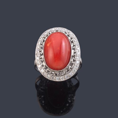 Lote 2090: Anillo con centro de coral talla cabujón con orla de brillantes de aprox. 0,60 ct en total.