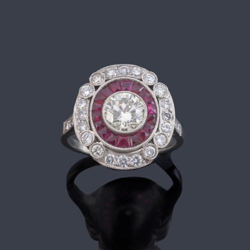 Anillo con diseño de 'ojo de perdiz' con brillante central de aprox. 1,05 ct y orla de rubíes calibrados de aprox. 1,00 ct y brillantes de aprox. 0,80 ct en total.
