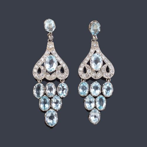 Pendientes largos con diseño de racimo realizado con aguamarinas talla oval de aprox. 10,86 ct en total con copete superior de brillantes de aprox. 1,32 ct en total.