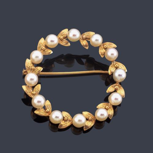 Broche con diseño circular con decoración de perlitas y motivos vegetales, realizado en oro amarillo de 18K.