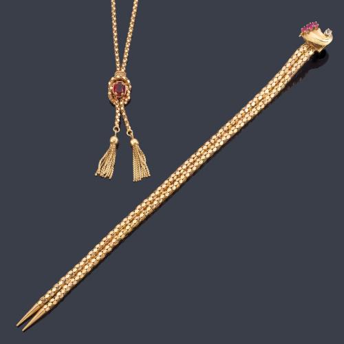 El collar presenta en la parte inferior un motivo en forma de nudo con un rubí sintético talla oval y doble borlón en oro amarillo.