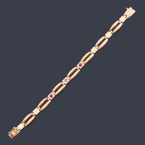 Pulsera años '40 con rubíes sintéticos y un diamante talla antigua en montura de oro rosa de 18K.