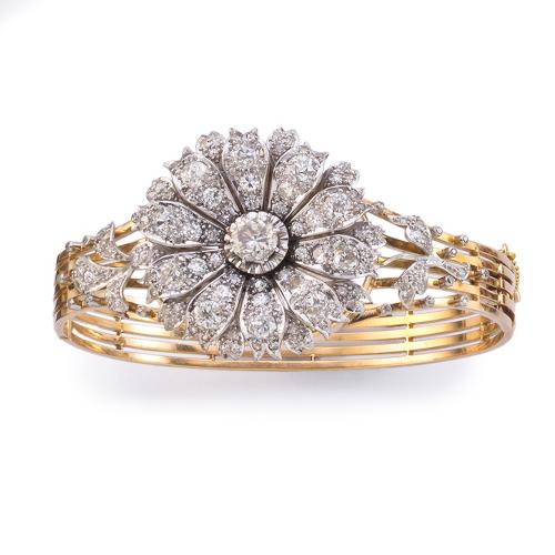 Pulsera rígida con motivo central floral con brillante central de aprox. 1,02 ct y pavé de diamantes talla antigua de aprox. 3,50 ct en total. Circa 1930.