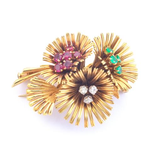 Broche con diseño floral años '70 con centro cuajado de esmeraldas, rubíes y brillantes en hilos de oro amarillo de 18K.