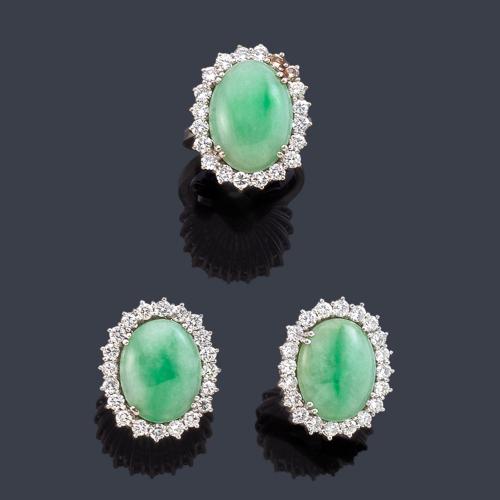 Pendientes cortos y anillo con tres piezas de Jade talla cabujón con orla de brillantes de aprox. 3,20 ct en total.