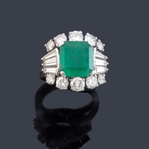 Anillo años '60 con esmeralda central de aprox. 3,75 ct con diamantes talla brillante y trapecio de aprox. 2,40 ct en total.