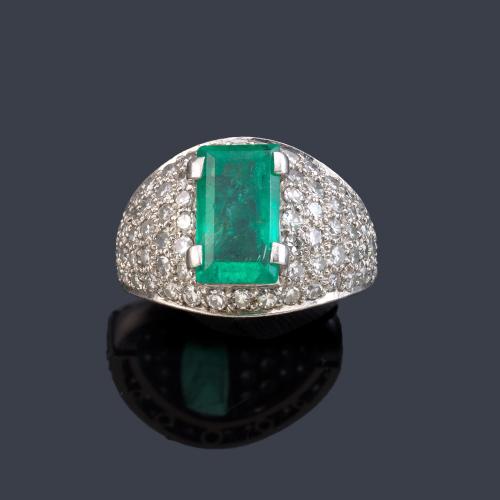 Anillo bombé con esmeralda central de aprox. 3,50 ct sobre pavé de diamantes talla 8/8 de aprox. 0,90 ct en total.
