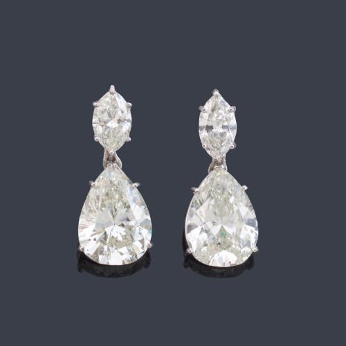 Importantes pendientes largos con pareja de diamantes talla perilla de aprox. 3,45 ct y 3,58 ct respectivamente con dos diamantes talla marquís de aprox. 0,55 ct cada uno. Certificados IGE.