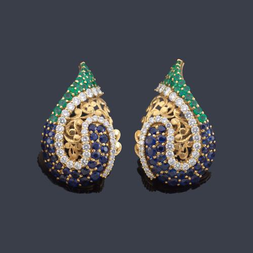 Pendientes con diseño de ala con esmeraldas, zafiros y brillantes de aprox. 4,20 ct en total.