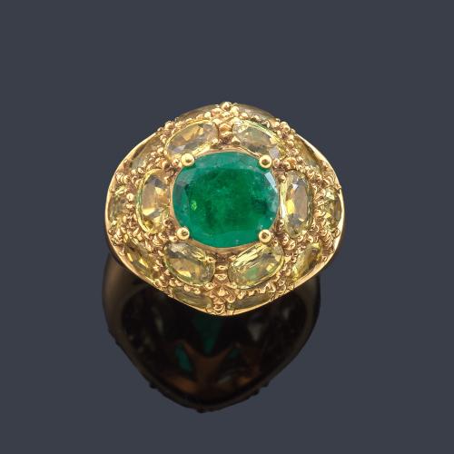 Anillo con esmeralda talla oval de aprox. 1,60 ct con cuajado de cuarzos citrinos talla oval.