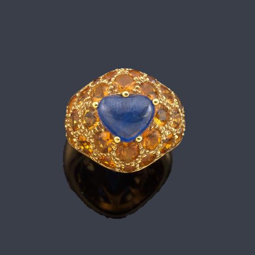 Anillo con zafiro central talla corazón con pavé de zafiros amarillos engastados en grano.