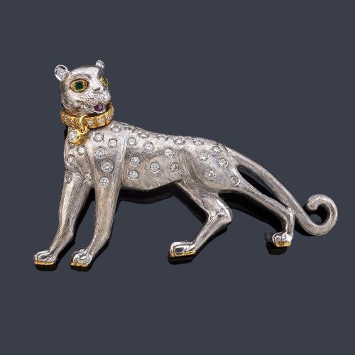Broche con diseño de pantera con salpicado de brillantes de aprox. 3,00 ct en total con rubí y pareja de esmeraldas.