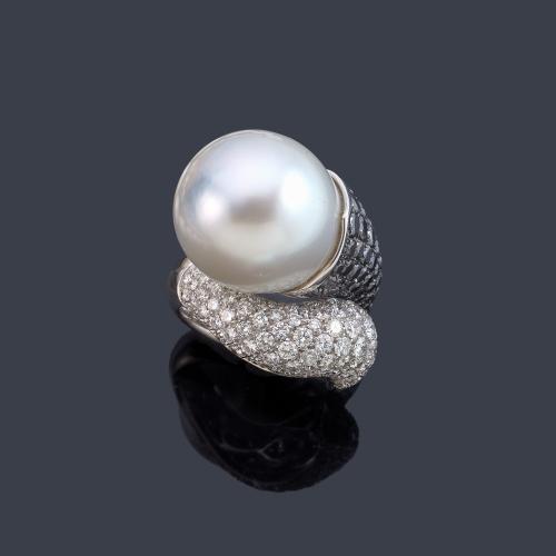 Anillo con gran perla australiana de aprox. 18,44 mm con brazos contrapeados con pavé de brillantes negros e incoloros.