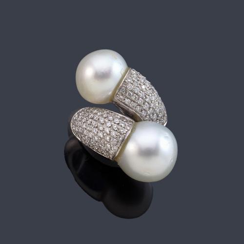Anillo 'Tú y Yo' con pareja de perlas Australianas de aprox. 14,00 mm y 13,52 mm con remate de pavé de brillantes.