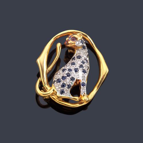 Broche - colgante con motivo de leopardo con cuajado de brillantes y zafiros.