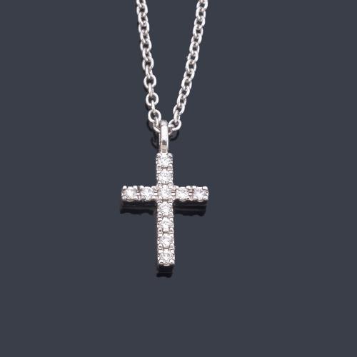 Cruz con brillantes de aprox. 0,05 ct en total en montura y cadena de oro blanco de 18K.