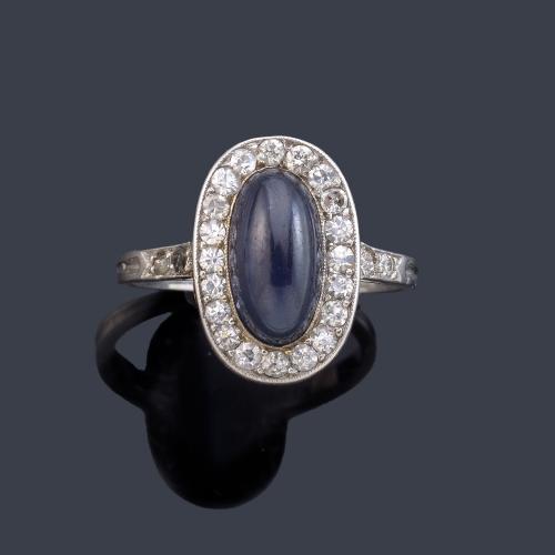 Anillo con zafiro central talla cabujón de aprox. 3,36 ct con orla de diamantes talla 8/8 en montura de platino.