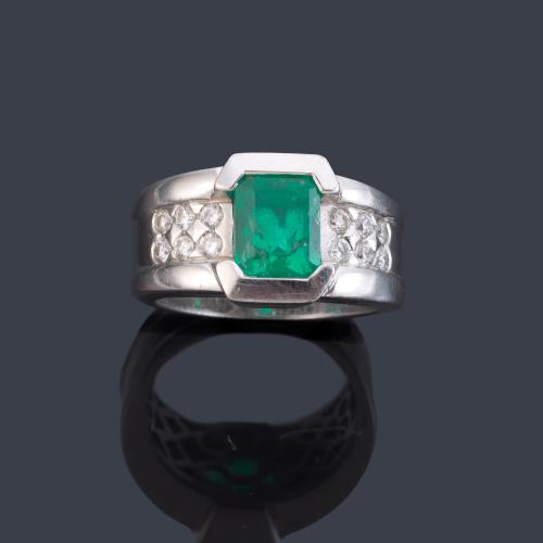 Anillo con esmeralda talla esmeralda de aprox. 2,00 ct con banda de brillantes en ambos lados.