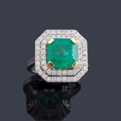 Anillo con esmeralda Colombiana de aprox. 4,04 ct con doble orla de brillantes de aprox. 1,00 ct en total.